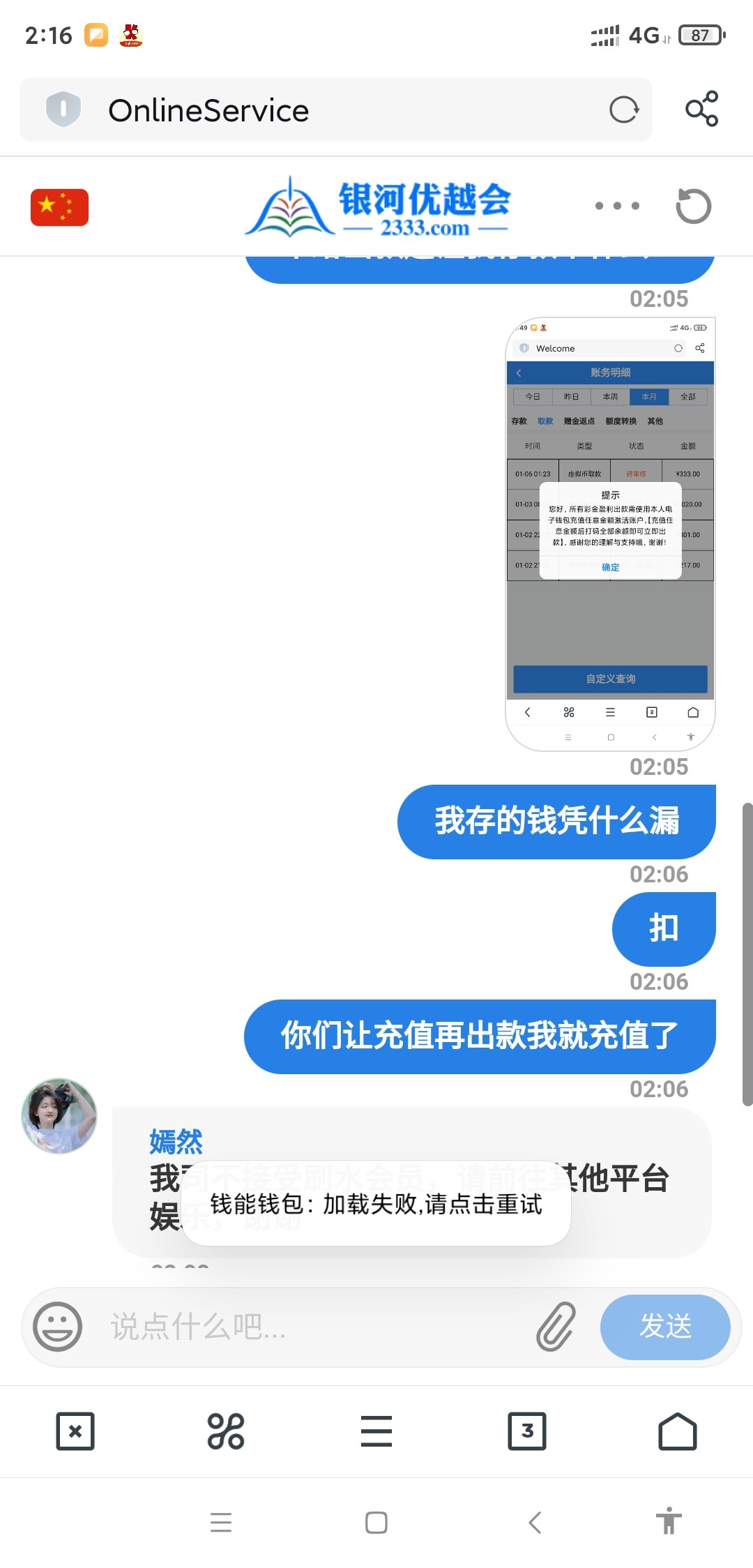 签到金打到出款,提款让充值任意金额,等你存完款再提款就直接清零账号封号了,不存款再去试着提款,他只会给你退回提示你充值,等你冲完值,才会给你清零封号。就是看到有人说出款了,才存了一百试试,结果就被黑了,就玩个麻将胡了,刷水刷它码。