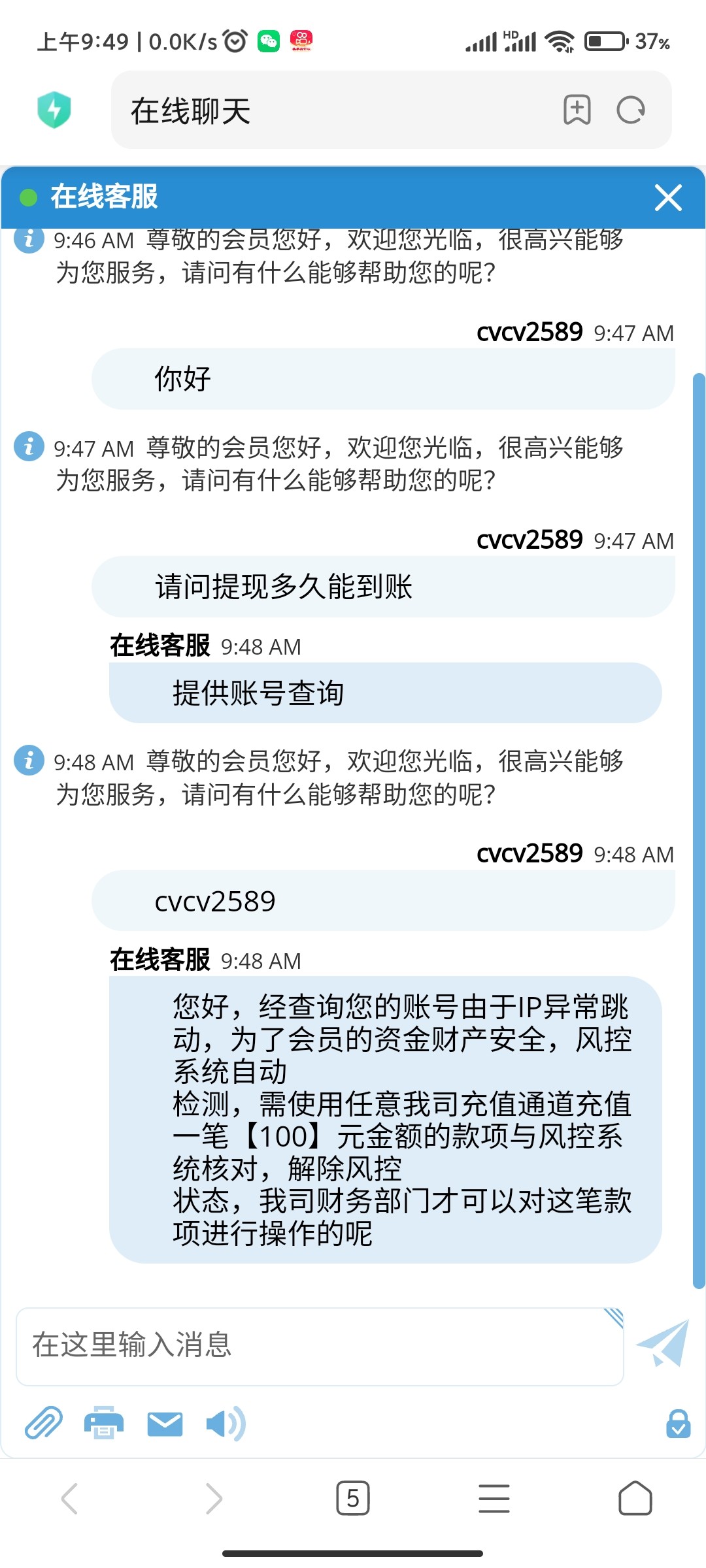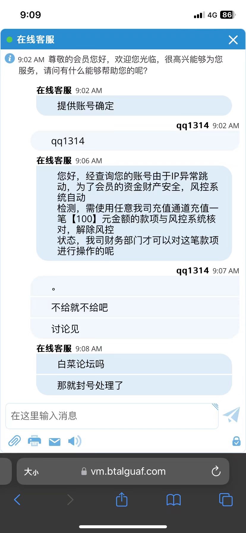 假台子 客服一夜不在线 现在在线了 让充值100才能提
