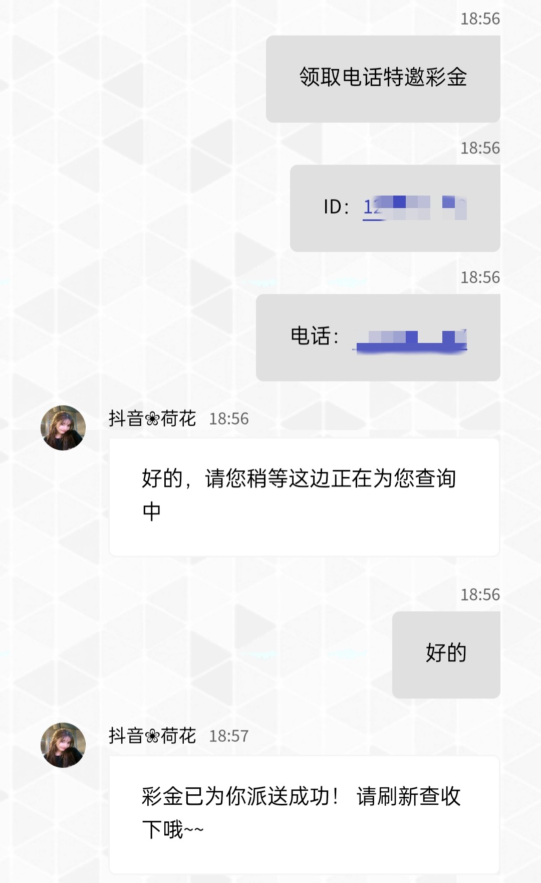 碰瓷电话特邀,下载APP手机号码登入然后复制ID联系在线客服跟客服说领取电话特邀彩金发ID和电话给他查!