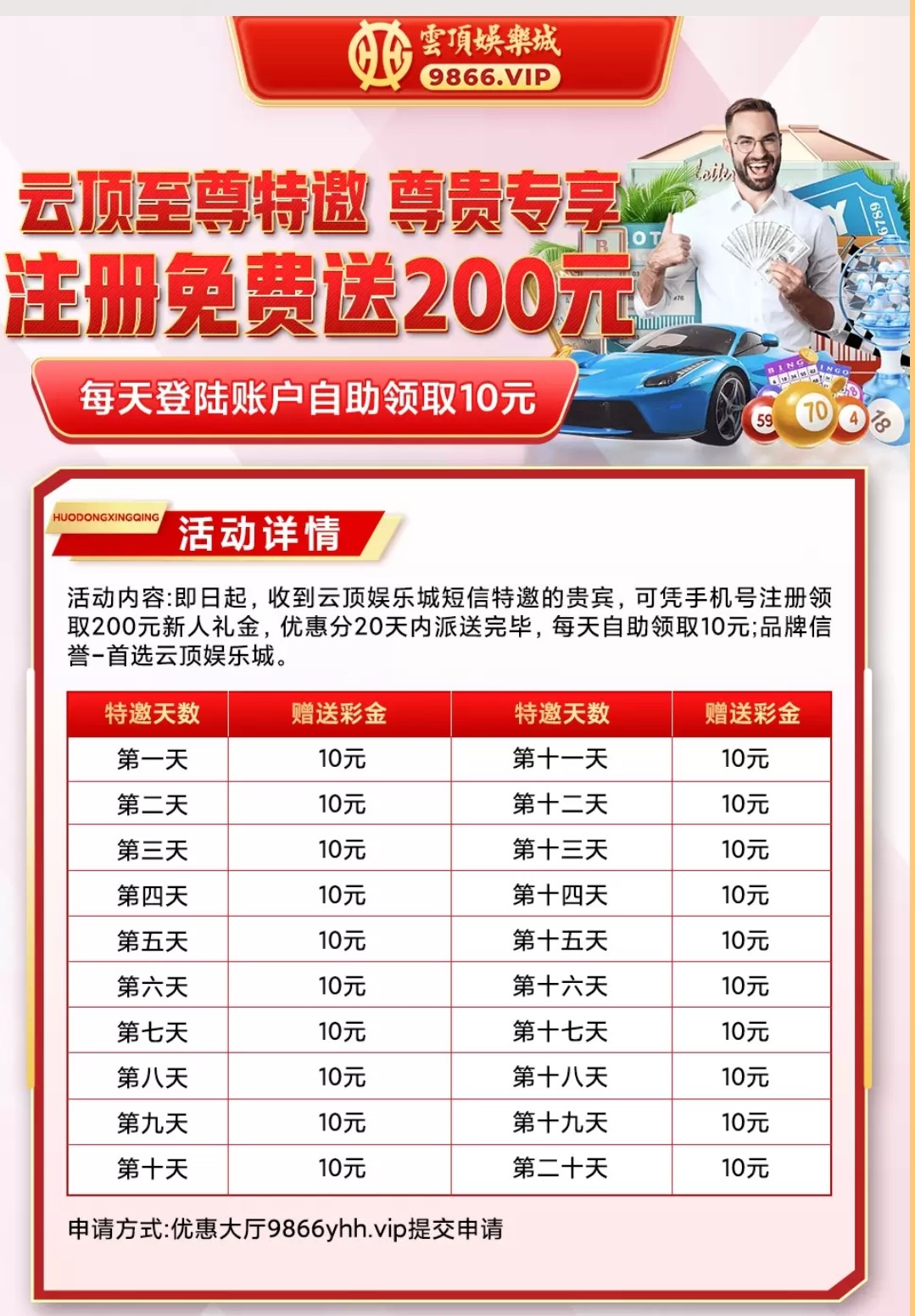 碰瓷短信特邀,200彩金分20天送每天送10彩金可以每天过了12点去申请,注册绑定银行卡手机号在活动办理大厅申请,具体自行查看优惠!网址:9866yhh.vip