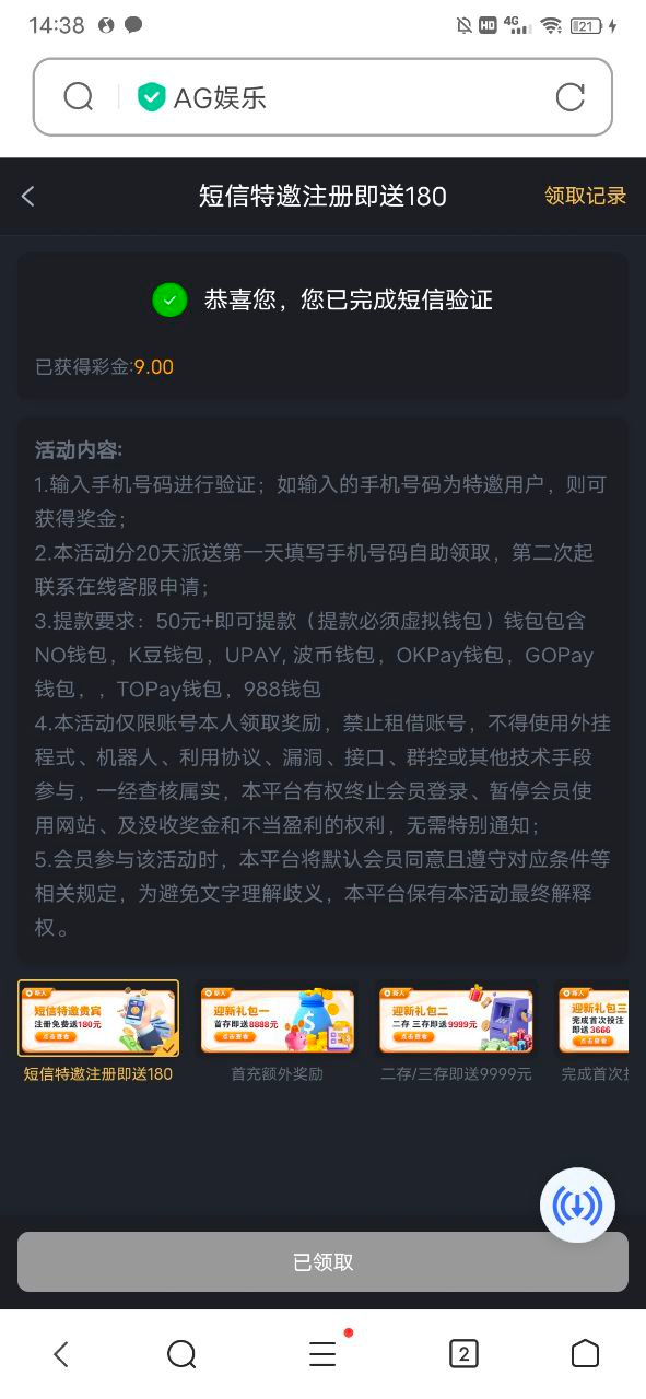 优惠完成短信验证领取9元,第二天找客服在申请9元,彩金无限制满足50电子钱包出款。
