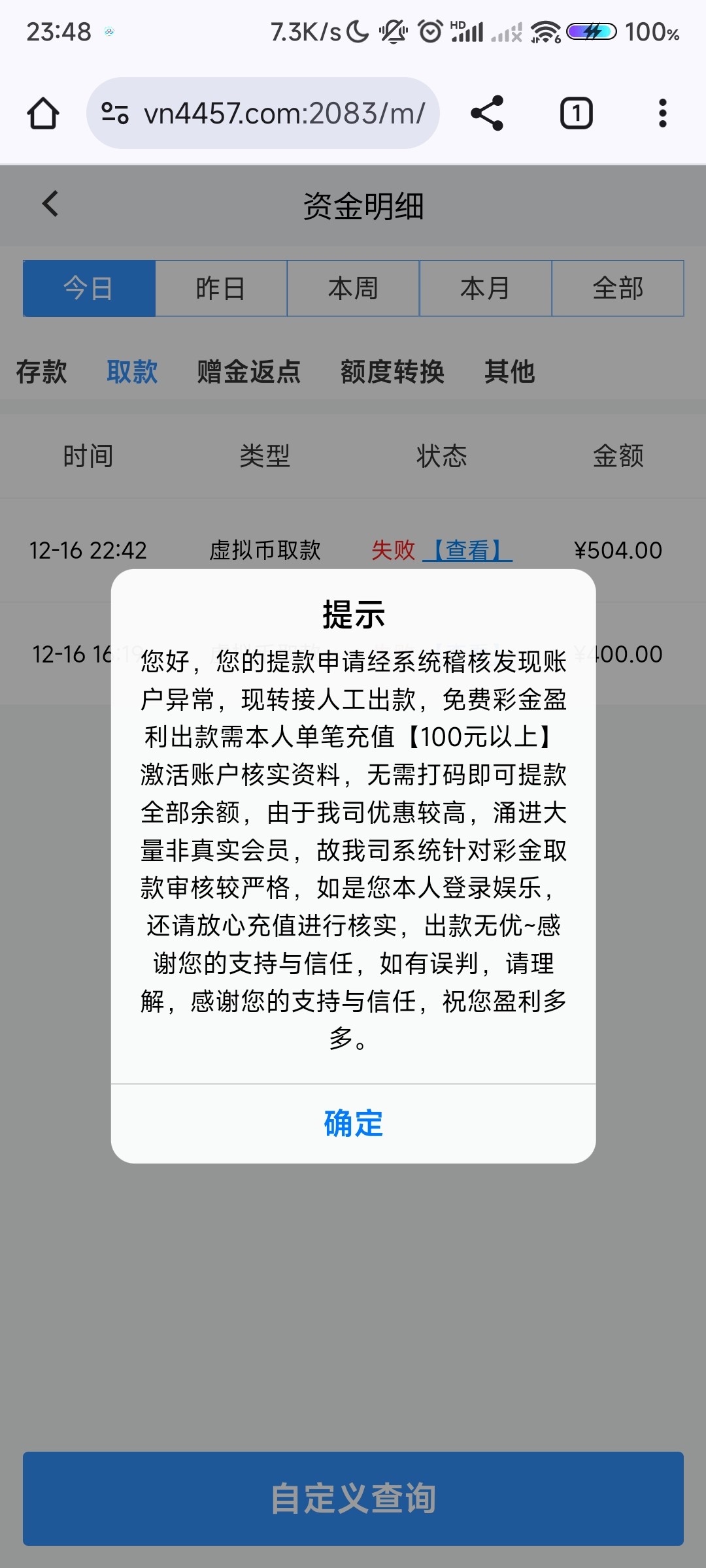 专门黑钱的台子。并且后台一直在控制,查看用户活动记录,如果你点击存款界面但是没有存款成功,过几天他们会打电话重新给你送88或者188,直到你打到提现的时候就告诉你要无限充值了!!记住了,是无限充值也不可能提款出来!!详细套路看图: