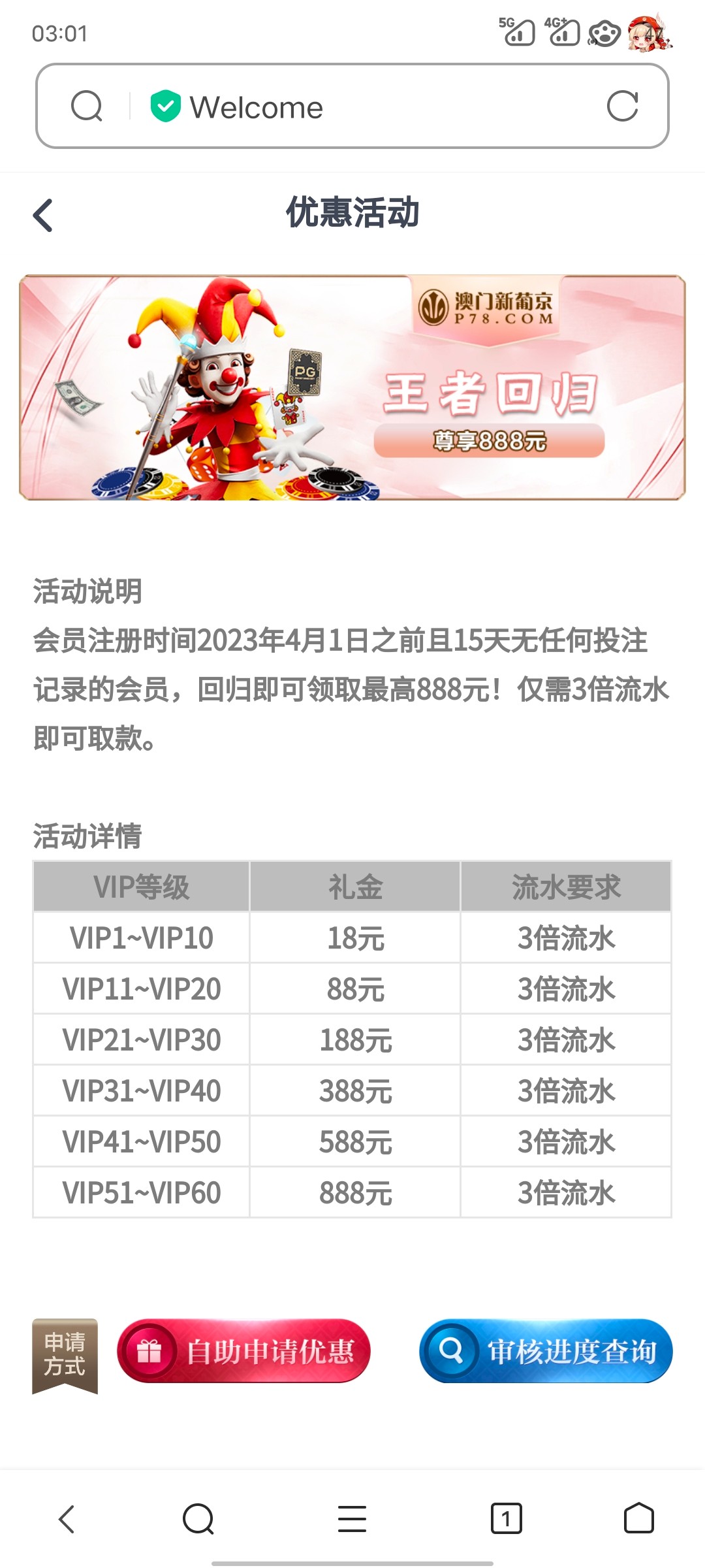 4.1日之前注册并且15天内没有任何流水记录的 在优惠大厅-王者回归里申请回馈彩金18-888  限制棋牌/电子/捕鱼